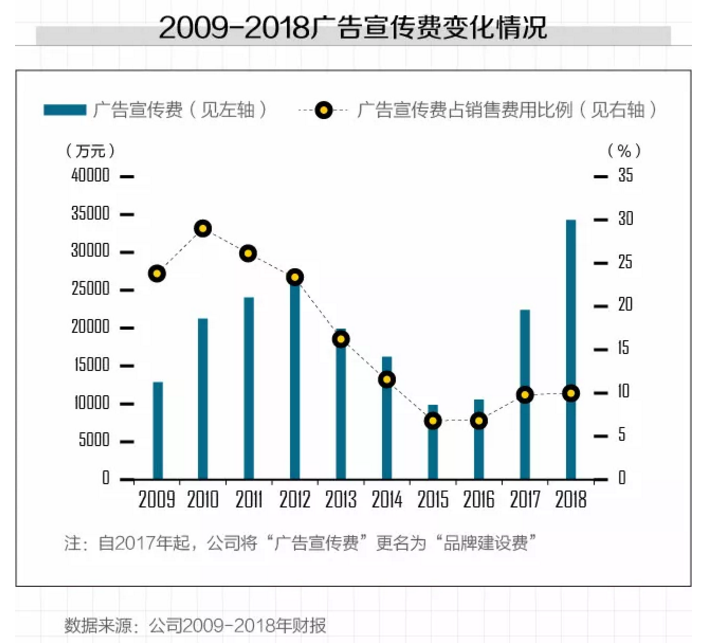 在上述广告宣传费用变化图中,不难读出这样一个信息:近年来,康恩贝的广告宣传费(2017年起更名为“品牌建设费”)已呈现出回升的态势。与此同时,广告宣传费隶属的销售费用则以更高的速度疯狂上涨着。