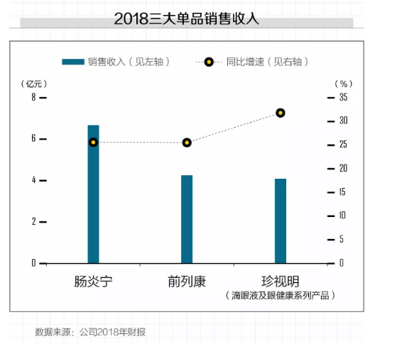 据公司财报介绍,2018年,康恩贝大品牌系列产品总共实现了50.76亿元的营收,高达总营收的四分之三,其中“肠炎宁”、“前列康”、“珍视明”均表现不俗。
